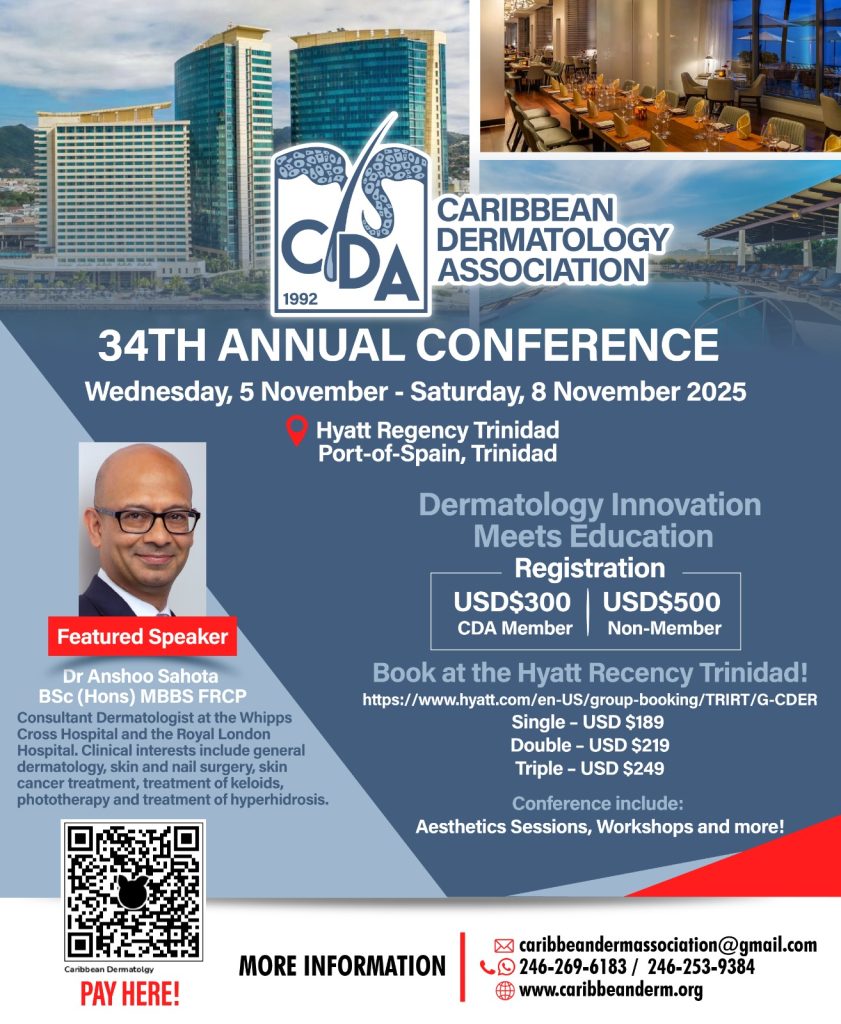 Currently holds a masters degree in dermatology from King’s College, London. A proud member of the Caribbean Dermatology Association and the American Academy of Aesthetics Medicine.