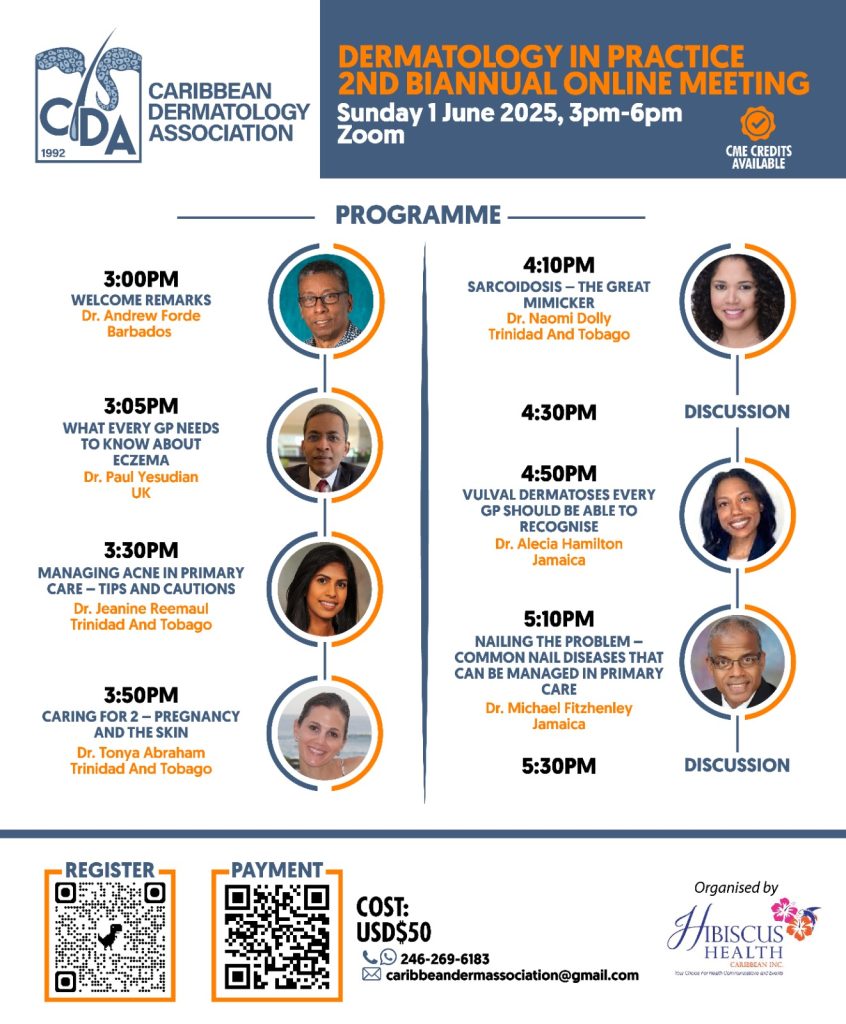 The Dermatology in Practice Online CME event will cover a host of dermatological topics including Eczema, Managing Acne, Pregnancy & the Skin, Sarcoidosis, Vulval Dermatoses & Common Nail Diseases. The goal is to educate on common dermatological issues that pop-up in practice.  The faculty includes a host of dermatologists from the UK, Trinidad and Tobago and Jamaica and the CDA invites general practitioners, nurses and other health care professionals to attend the event.  The host will be Dr. Andrew LeRoy Forde of Barbados.
