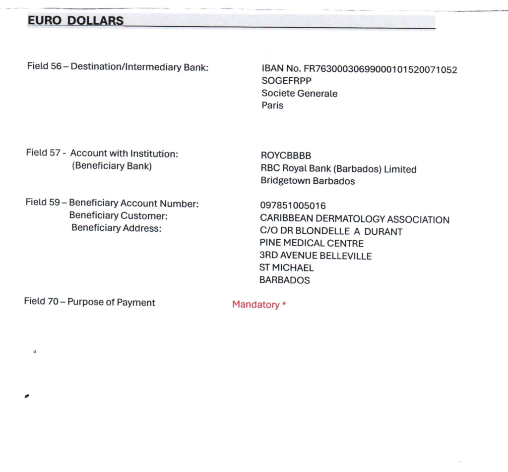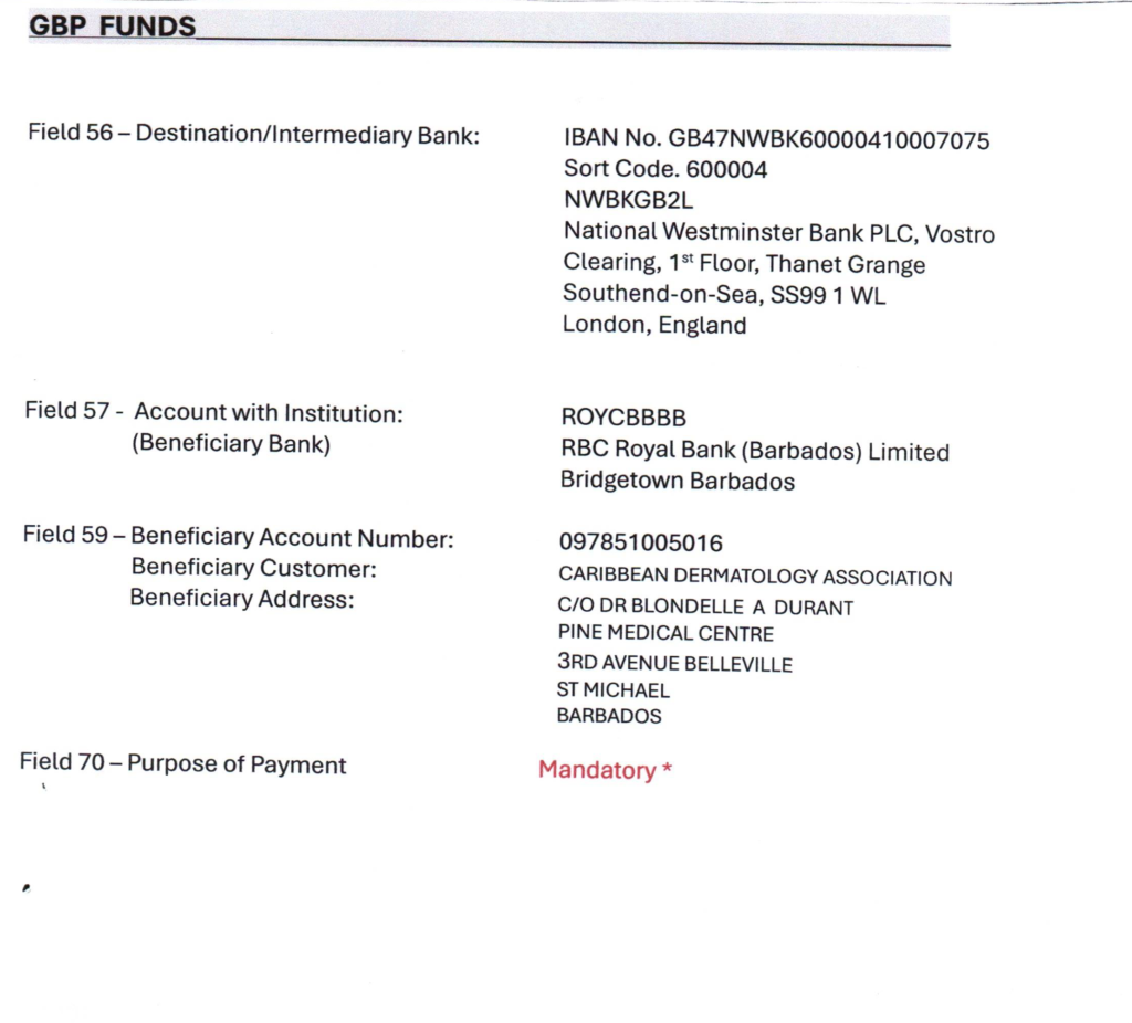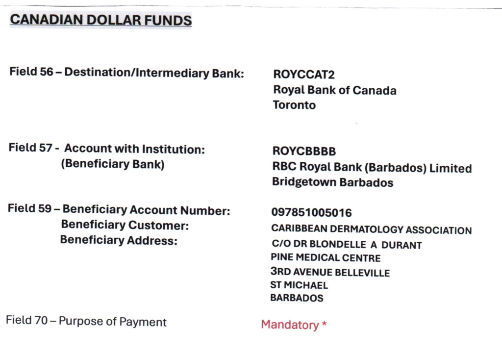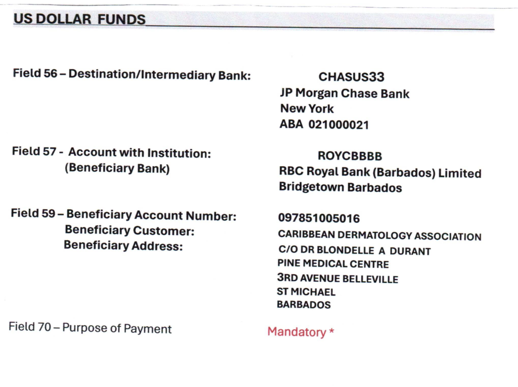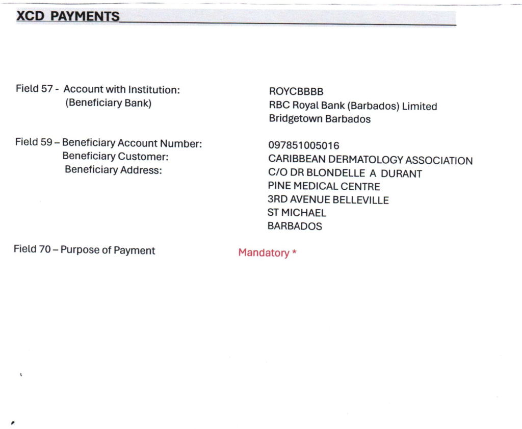 The Caribbean Dermatology Association welcomes payment of membership fees, conference fees and sponsorship fees.